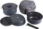 Een complete en zeer compacte 7-delige pannenset. Alle pannen uit deze set zijn voorzien van een poedercoating aan de buitenkant en een anti-aanbaklaag aan de binnenkant. Door het gebruik van aluminium is deze kookset zeer licht van gewicht. Deze aluminium pannen zijn te gebruiken op de warmtebronnen gas, keramisch en elektrisch. Deze pannenset bestaat uit 3 kookpannen, 2 koekenpannen, een afgietdeksel en een pannengreep. De meegeleverde beschermhoes zorgt dat de volledige set compact kan worden opgeborgen. Afmetingen kookpannen (Øxh): 23x12, 21x8 en 17x7 cm. Afmetingen koekenpannen (Øxh): 24x4,5 en 18,5x3 cm. Afmetingen genest (lØxh): 24x16 cm. Inhoud: 1,4, 2,5 en 4,4 liter.