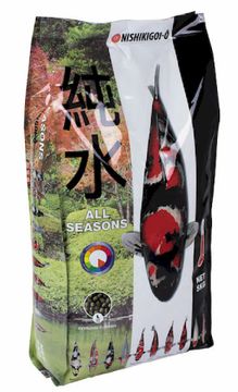 Wij adviseren het All Season voer van Nishikigoi wanneer het water onder de 15°C komt, omdat ook onder deze omstandigheden het voer goed verteerbaar is voor de koi’s. De minimale temperatuur waarbij de vissen gevoerd horen te worden in de winter is 10°C. Daarbij is het All Season voer van Nishikigoi verrijkt met prebioticum, wat zorgt voor een betere spijsvertering. Hierdoor blijft de darmgezondheid van de vis goed, dit is van groot belang voor de algehele gezondheid. Het voer bevat ook stoffen waardoor de kleur van de vis haar mooie kleur behoudt en zelfs nog feller maakt.