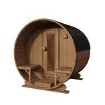 Hey! Is die 140 cm sauna je nét wat te knus? Snappen we. Maak kennis met zijn grotere broer: de Thermowood barrelsauna van 180 cm! Dit is de perfecte maat voor de meeste tuinen en hij heeft dé upgrade die je zoekt: een eigen voorportaal (zeg maar gerust een mini-veranda). Zo heb je binnenin lekker de ruimte voor twee personen én een handige plek om je om te kleden.